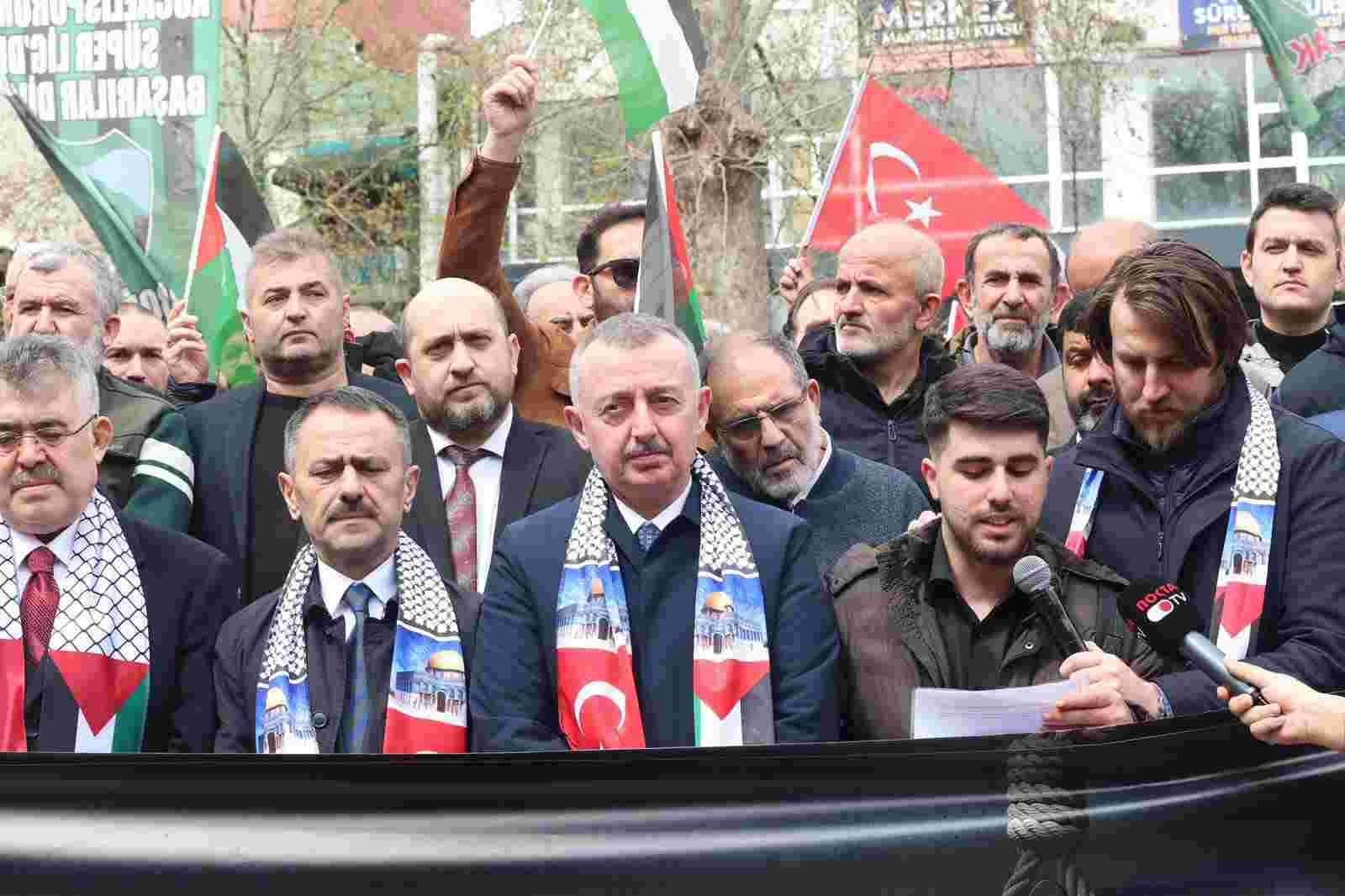 Kocaeli Büyükşehir Belediye Başkanı Tahir Büyükakın, İsrail Meclisi’nin aldığı ve tartışmalı, Filistinli esirlerin idam edilmesinin önünü açan yasaya tepki amacıyla gerçekleştirilen basın açıklamasına katıldı.