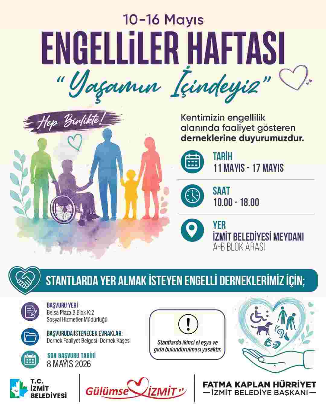 11–17 Mayıs tarihleri arasında İzmit Belediye Meydanı A-B blokları arasında kurulacak stantlarda engelli dernekleri yer alacak. Sosyal Hizmetler Müdürlüğü koordinasyonunda her gün 10.00-18.00 saatleri arasında gerçekleştirilecek etkinlikte ziyaretçiler, derneklerin çalışmalarını yakından tanıma fırsatı bulurken aynı zamanda dayanışmaya katkı sağlayabilecek.