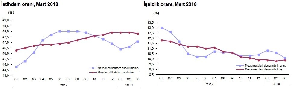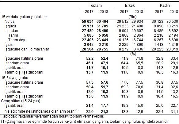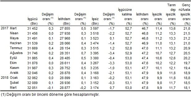 Türkiye genelinde 15 ve daha yukarı yaştakilerde işsiz sayısı 2018 yılı Mart döneminde geçen yılın aynı dönemine göre 432 bin kişi azalarak 3 milyon 210 bin kişi oldu. İşsizlik oranı 1,6 puanlık azalış ile %10,1 seviyesinde gerçekleşti. Aynı dönemde; tarım dışı işsizlik oranı 1,8 puanlık azalış ile %11,9 olarak tahmin edildi. Genç nüfusta (15-24 yaş) işsizlik oranı 3,7 puanlık azalış ile %17,7 olurken,15-64 yaş grubunda bu oran 1,7 puanlık azalış ile %10,3 olarak gerçekleşti.