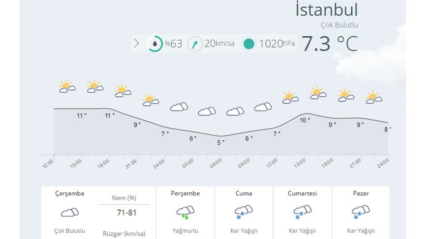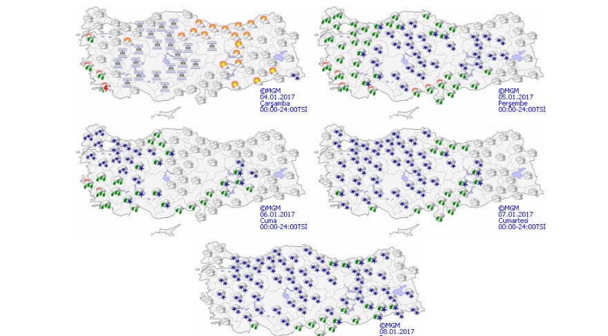 Meteoroloji Genel Müdürlüğü tarafından yapılan son değerlendirmelere göre; Marmara’nın doğusu, Doğu Akdeniz, İç Anadolu, Karadeniz, Doğu ve Güneydoğu Anadolu ile Kırklareli, Tekirdağ, Kütahya, Afyonkarahisar ve Isparta çevrelerinin yağışlı geçeceği tahmin ediliyor. Genellikle yağmur ve sağanak, iç ve doğu bölgelerde karla karışık yağmur ve kar şeklinde görülecek yağışların; Siirt ve Şırnak çevrelerinde kuvvetli yağmur ve sağanak, Bitlis ve Hakkari çevreleri ile Van’ın güney kesimlerinde yoğun kar şeklinde olması bekleniyor.