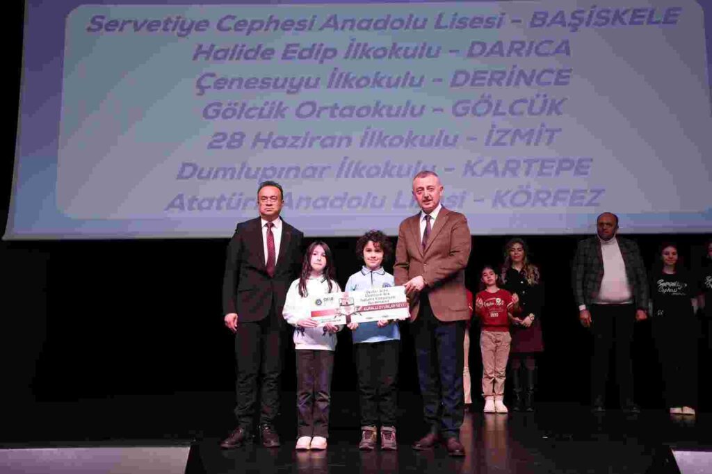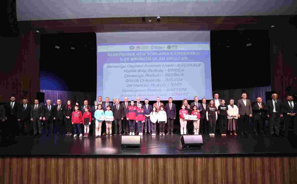 Vali İlhami Aktaş da çevre bilincinin önemine değinerek “Siz öğrencilerin geri kazanım bilinci büyük katkı sağladı. Hepinize teşekkür ediyoruz. Atık oluşmadan çözümler üretmek, sorunların önüne geçecektir. Umarım dünyanın daha temiz kalmasına katkı sunarsınız” dedi. Konuşmaların ardından, Kocaeli genelinde düzenlenen okullar arası elektronik atık toplama kampanyasında birinci olan Başiskele Servetiye Cephesi Anadolu Lisesi, Darıca Darıca Halide Edip İlkokulu, Derince Çenesuyu İlkokulu, Gölcük Ortaokulu, İzmit 28 Haziran İlkokulu, Kartepe Dumlupınar İlkokulu ve Körfez Atatürk Anadolu Lisesi öğrencilerinin ödüllerini Vali Aktaş ile Başkan Büyükakın takdim etti.