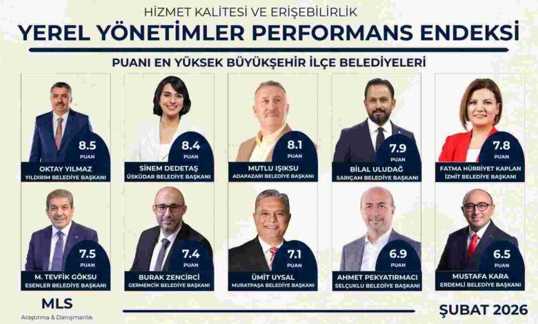 Daha önce açıklanan birçok kamuoyu araştırmasında zirvede bulunan İzmit Belediye Başkanı Fatma Kaplan Hürriyet, MLS Araştırma ve Danışmanlık’ın 2026 Şubat verilerine göre de en başarılı ilçe belediye başkanları arasında 7.8 puan ile 5’inci sırada yer aldı.